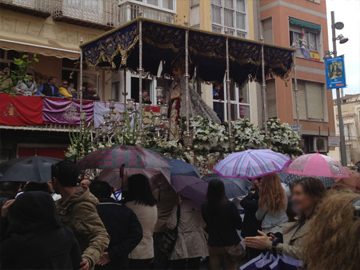 Y con la emoción del momento, suplicamos a nuestra Stma. Virgen para que nos conserven a ese extraordinario ramillete de esposas, novias, madres y hermanas que nos contemplan en silencio, adivinando en nuestros ojos el natural cansancio, paliado por la ilusión y la penitencia que entraña en todo cofrade procesionista. Los acordes musicales de nuestras marchas nos sacan de las divagaciones, del ensimismamiento en que estamos sumidos. Y, despreciando las molestias que produce el ir encerrado en nuestra prisión de raso, continuamos el desfile pasionario con el único pensamiento de que pronto os volveremos a ver.